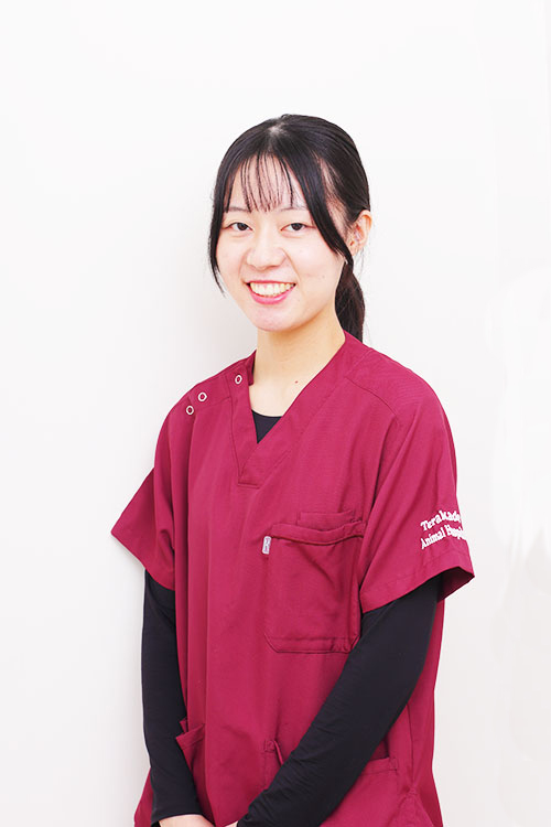 幼い頃から動物が好きで、動物にかかわる仕事がしたいと思い看護師を目指しました。家族の一員であるワンちゃんやネコちゃんたちのケアや生活のサポートだけでなく、飼い主様の不安や心配なことをしっかり聞き、安心していただけるようコミュニケーションを大切にしていきたいと思います。動物たちを飼い主様どちらにも信頼される看護師になれるようにがんばります。 |